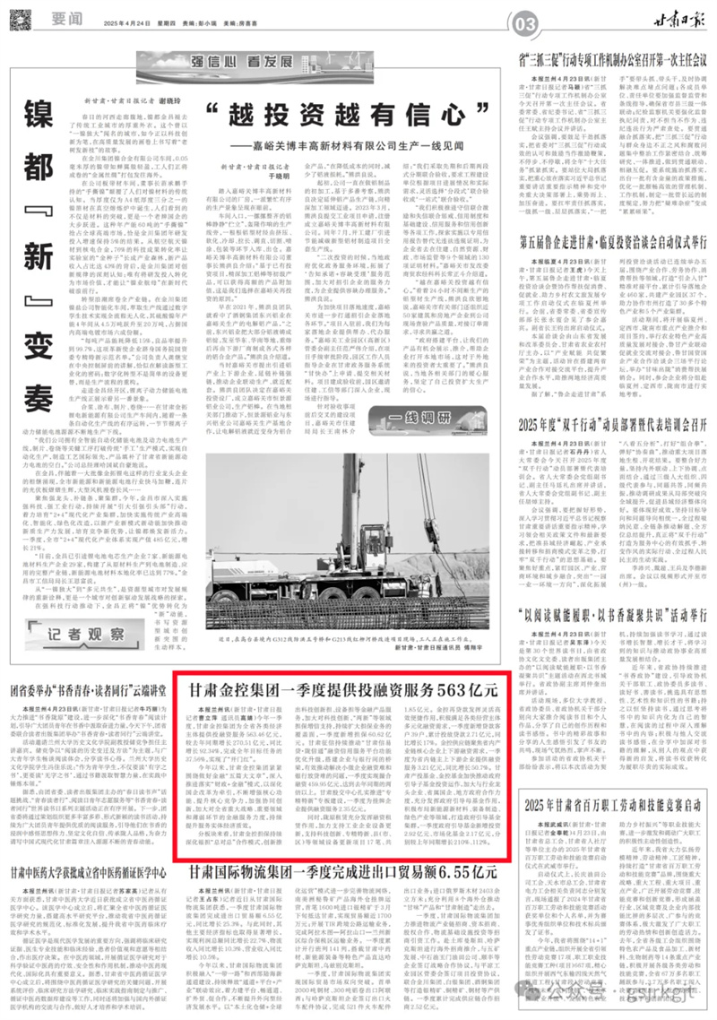 媒体关注 | 甘肃金控集团一季度提供投融资服务563亿元