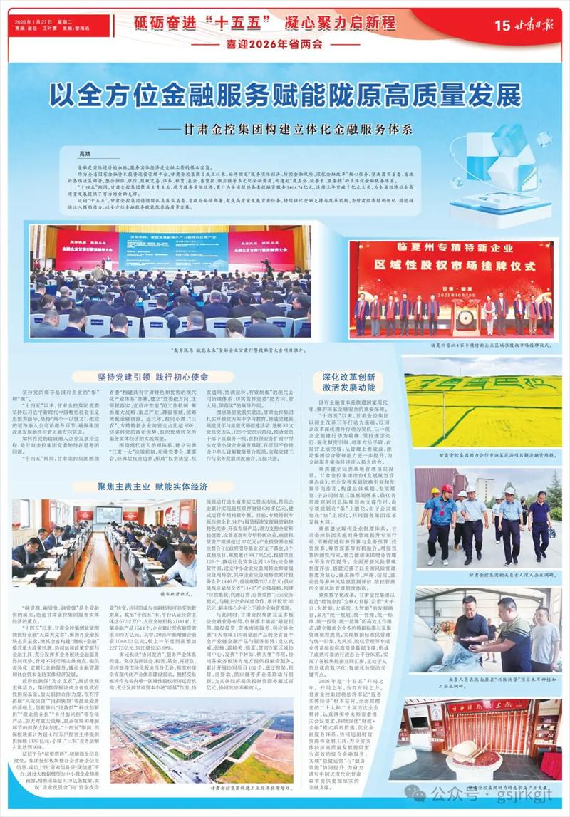 2026年是“十五五”开局之年。开局之年,当有开局之力。甘肃金控集团将始终牢记“服务实体经济”根本宗旨,全面贯彻党的二十大和二十届历次全会精神,认真落实中央和省委相关会议要求,持续深化“财政+金融”模式系列措施,优化金融服务体系,协同运用财政资源和金融工具,为全省实体经济高质量发展提供更为高效的综合金融服务,实现“稳健运营”与“服务效能”协同提升,为奋力谱写中国式现代化甘肃篇章提供更加坚实的金融支撑。(高婧)