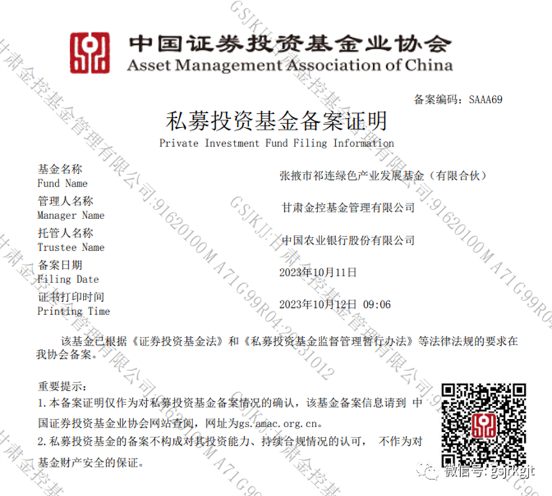 近日,张掖市祁连绿色产业发展基金(有限合伙)在中国证券基金业协会备案。该基金备案时正逢《私募投资基金监督管理条例》颁布实施,金控基金公司充分研究新规要求,并做足备案前的准备工作,为顺利通过基金备案奠定了基础。